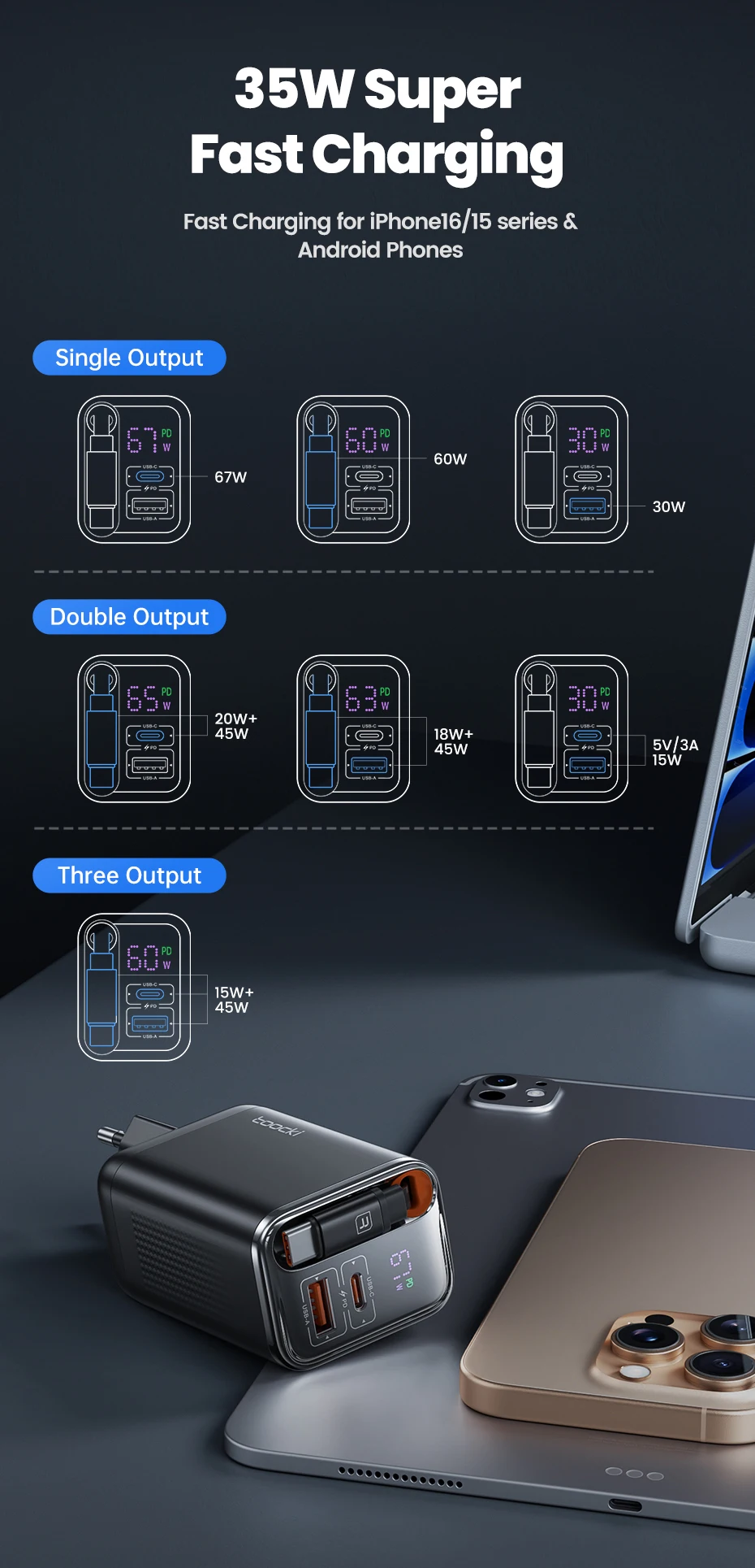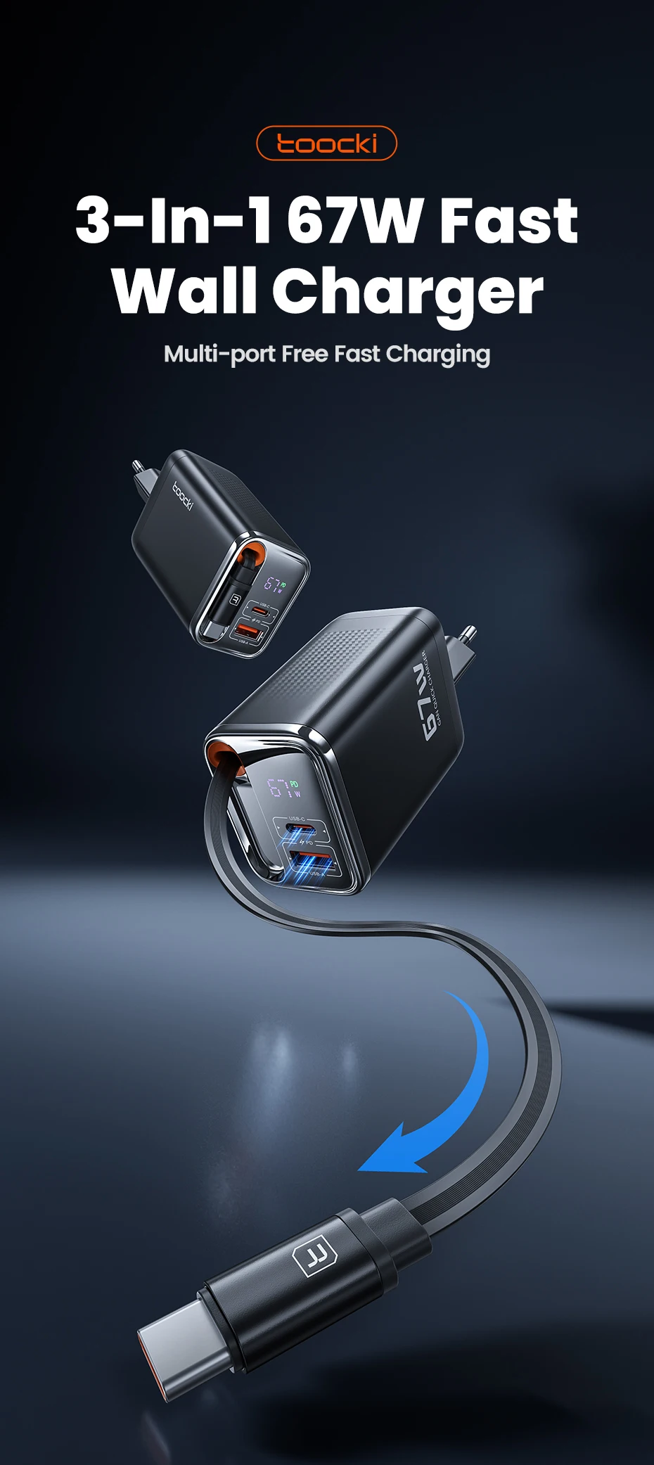 Simplify charging with the Toocki 67W GaN Fast Charger, a 3-in-1 powerhouse that combines multiple charging ports with a durable retractable USB-C cable. Built with next-gen GaN technology, it delivers faster, safer, and cooler performance in a compact body.