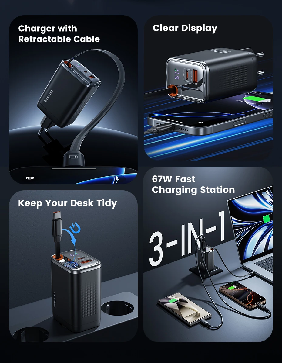 ✨ Replace your bulky chargers with the Toocki 67W GaN Retractable Cable Charger – the smarter way to power phones, tablets, and laptops.
